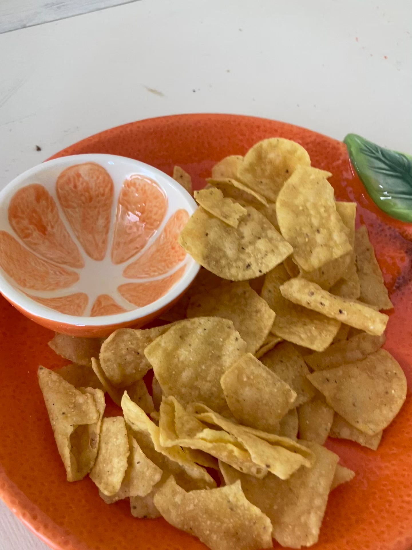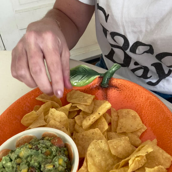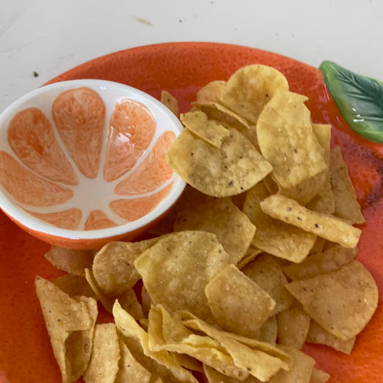 Perfect for serving your guests in any home in Orange! This two-piece, ceramic tray set would be perfect for chips and guacamole, veggies and hummus, or maybe just for everyday snacking!!! The orange slice bowl is connected to the larger plate.