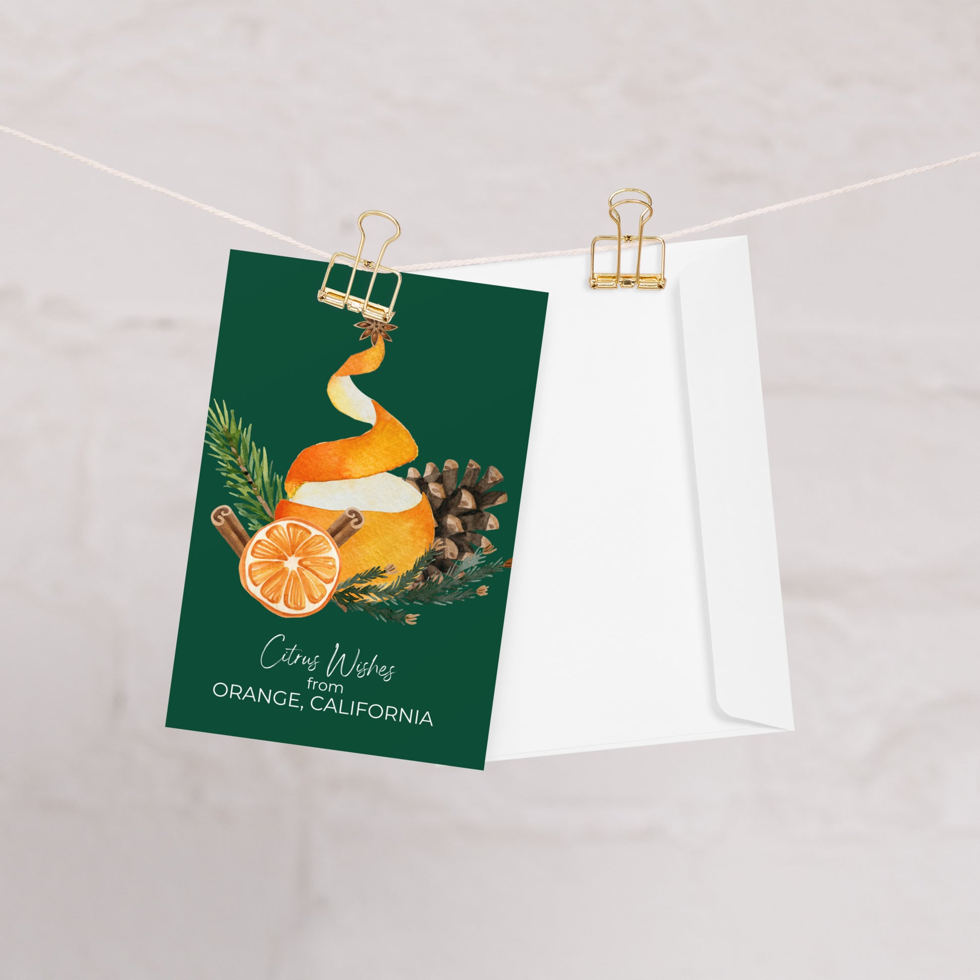 A rustic, natural Old Towne Orange themed Christmas card complete with orange peel tree.