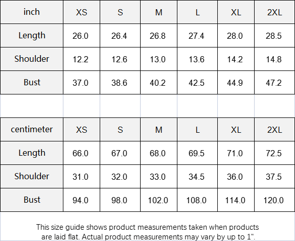 This size guide shows product measurements taken when products are laid flat. Actual product measurements may vary by up to 1".