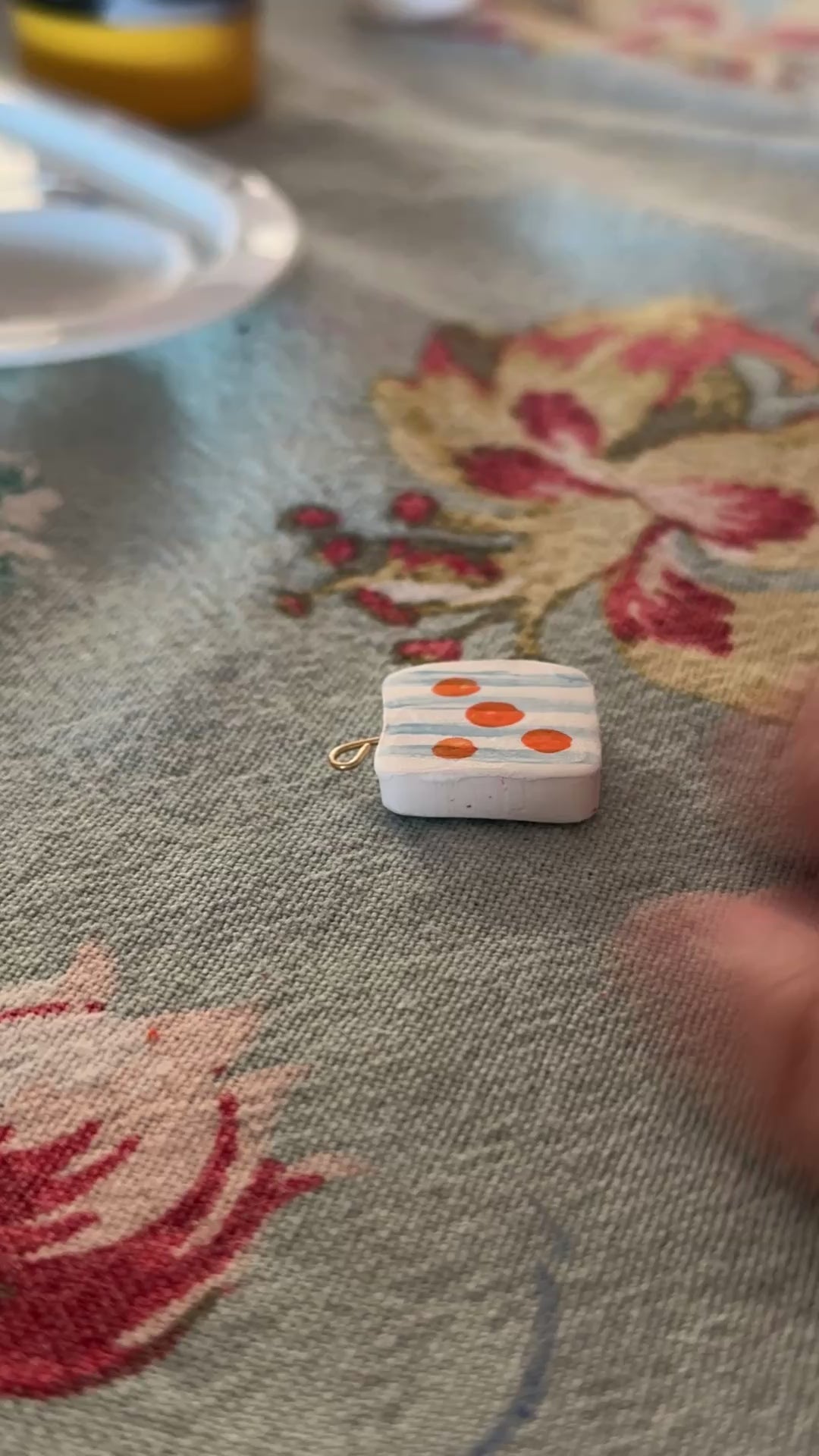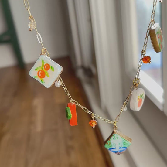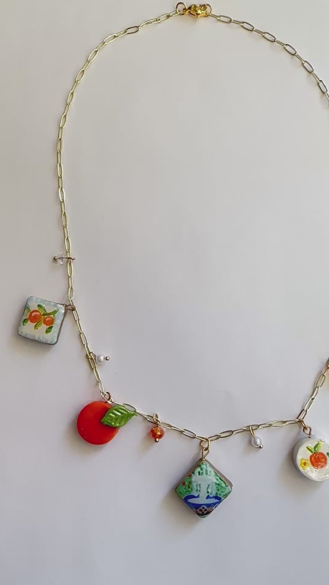 Every charm is individually sculpted and painted by hand, making each necklace truly one-of-a-kind. The charms are suspended from a delicate gold chain and accented with tiny beads that add a subtle sparkle, just like sunshine on the fountain water.