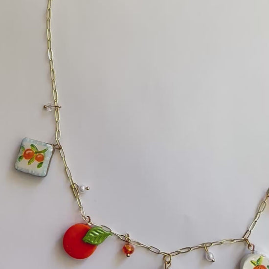This necklace features a collection of Orange-inspired charms including: