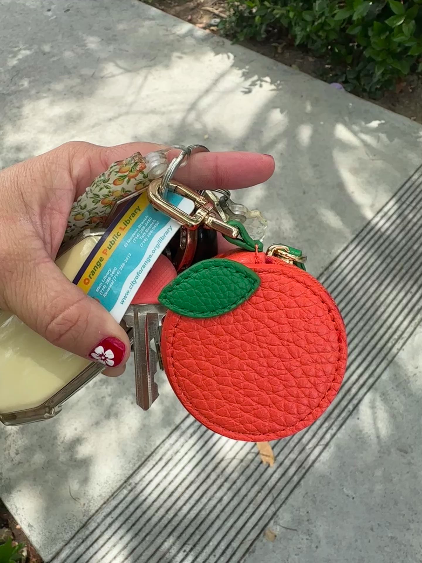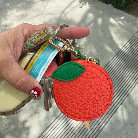 Keep your essentials close in the cutest way possible with this orange-inspired coin purse keychain! Made with vibrant quilted faux leather and finished with green leafy details, itโs the perfect blend of function and charm. Clip it to your keys or bag and stash a few dollars for your next outing to the Farmerโs Market, Street Fair, Car Show, or any of your favorite Old Towne Orange events.